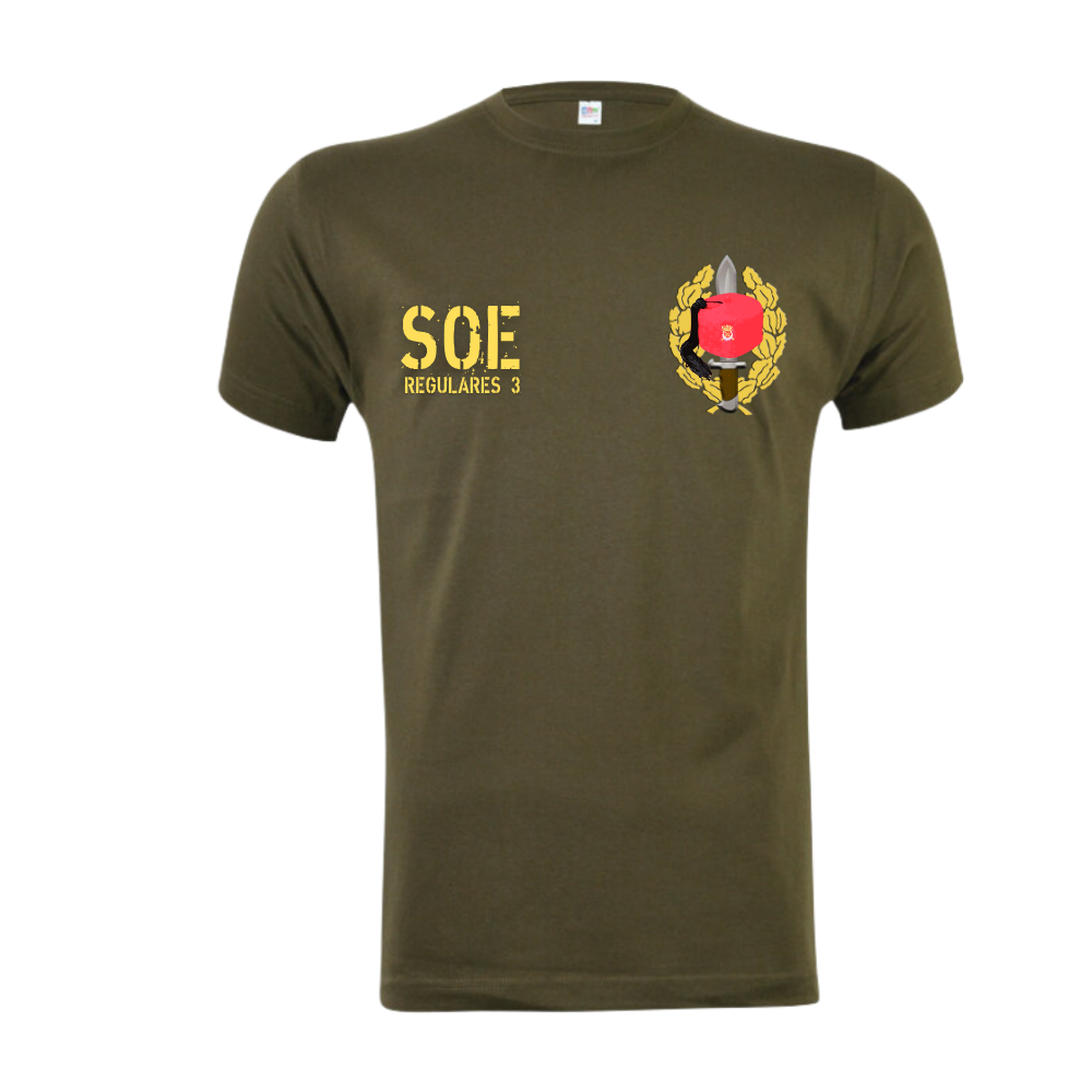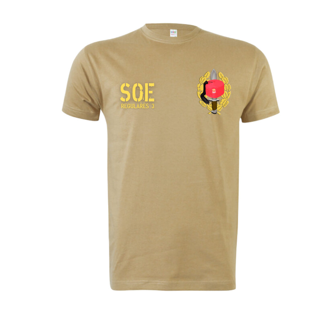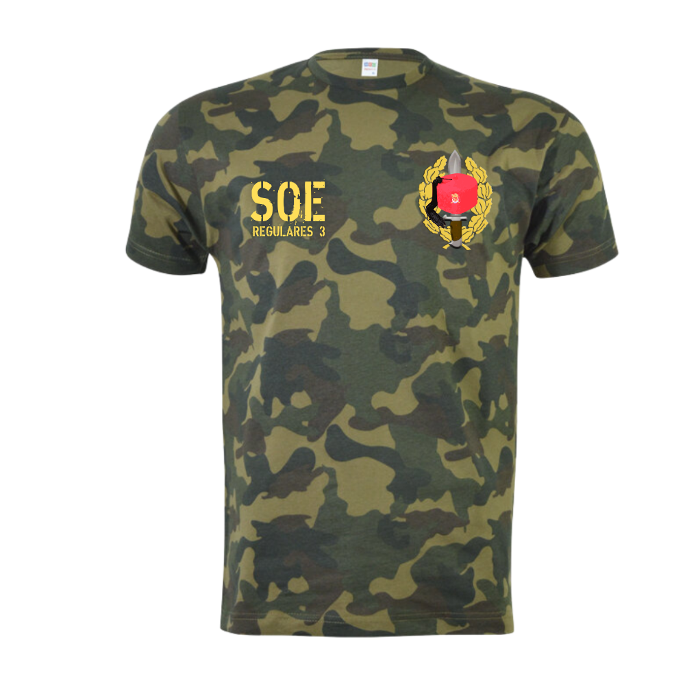 Camiseta manga corta, 100% algodón y cuello licra con tema ESCUDO DE SOE REGULARES Nº3 DE CEUTA. Un homenaje a esa sección de operaciones especiales.