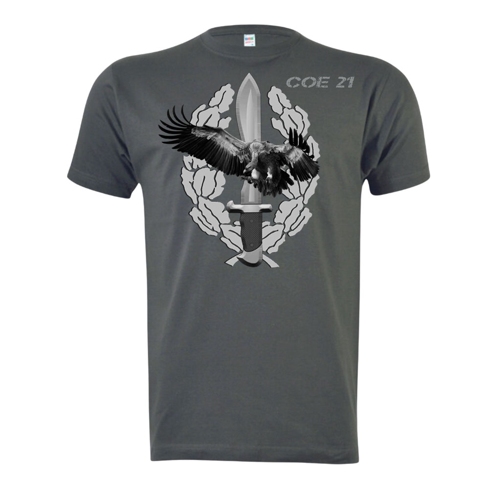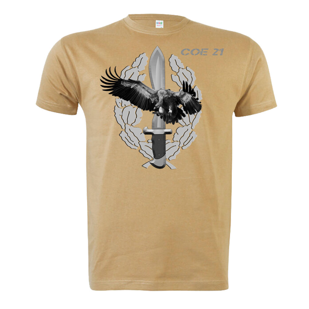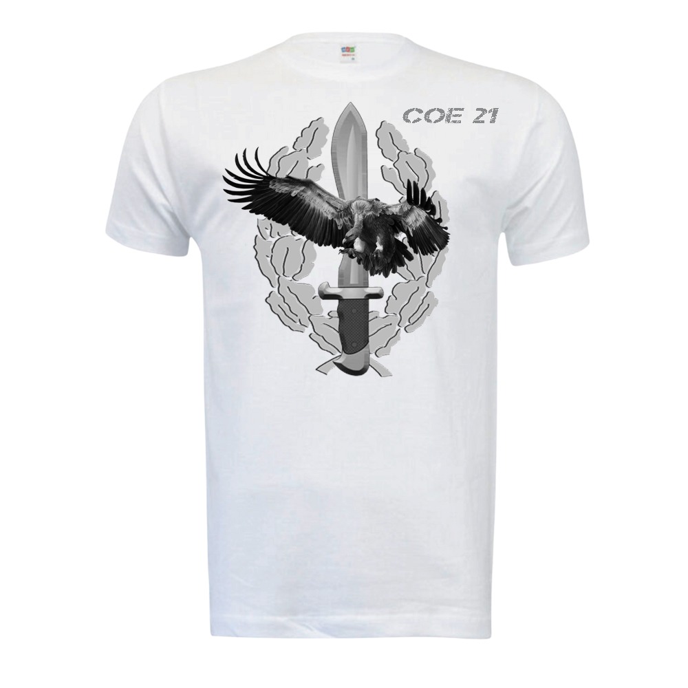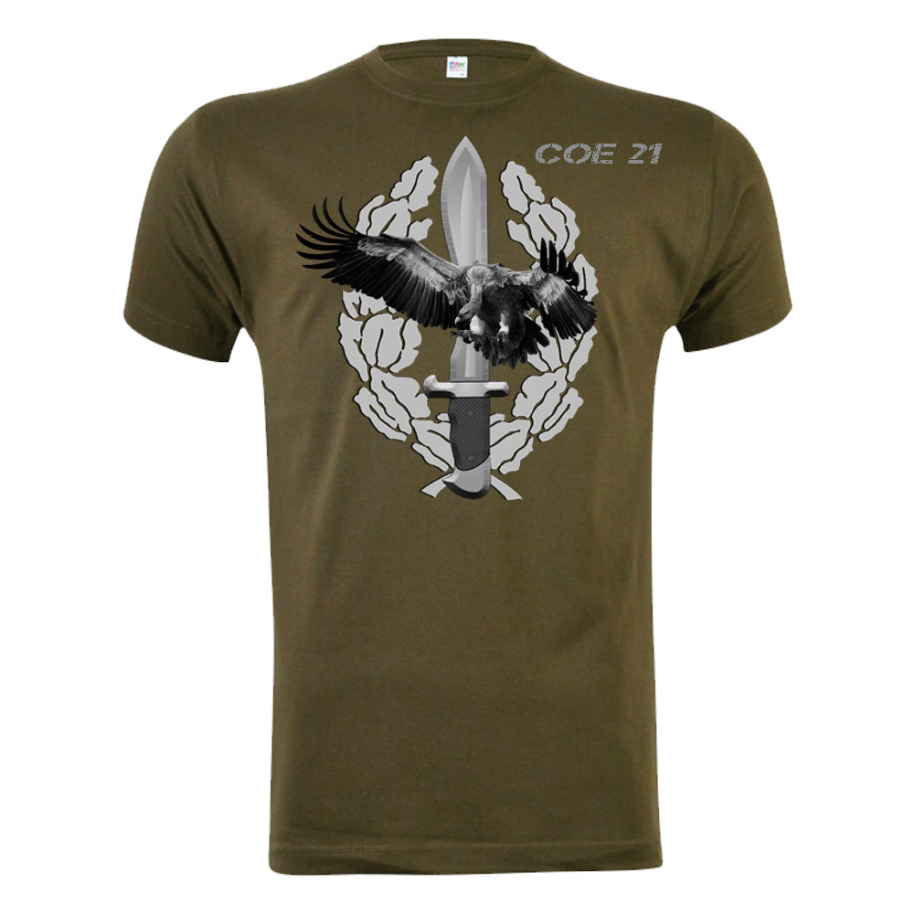 Camiseta manga corta, 100% algodón y cuello licra con tema de la COE 21. Esta camiseta es un homenaje a nuestra querida COE 21 y a todos los que tuvieron el privilegio de servir en esta unidad.